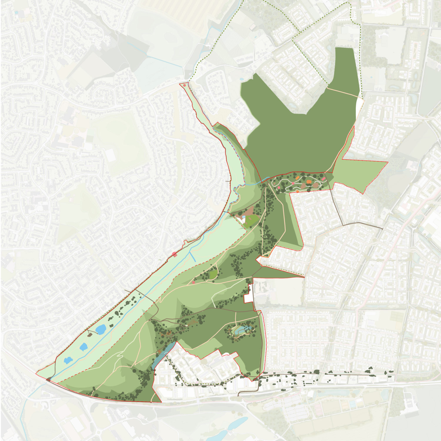 At the southern entrance to the park and set within the enhanced woodlands will be two Forest Schools, providing outdoor classrooms for environmental education and bushcraft training. A clearing in the woods will host the Woodland Loop, offering outdoor learning spaces, a MUGA, and adventure play area tailored for teenagers. Easily reached by foot, cycle, or car, these outdoor learning areas are designed to be inclusive and accessible for all young people and by integrating play and education into a woodland settings, they support ecological enrichment and provide meaningful social infrastructure to locals.