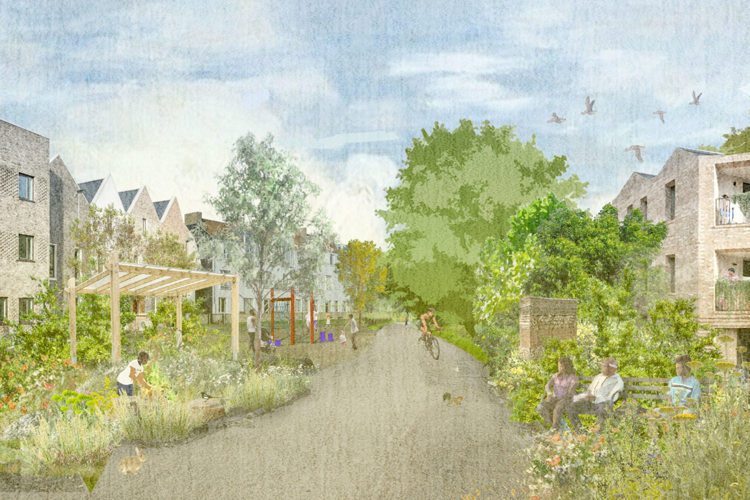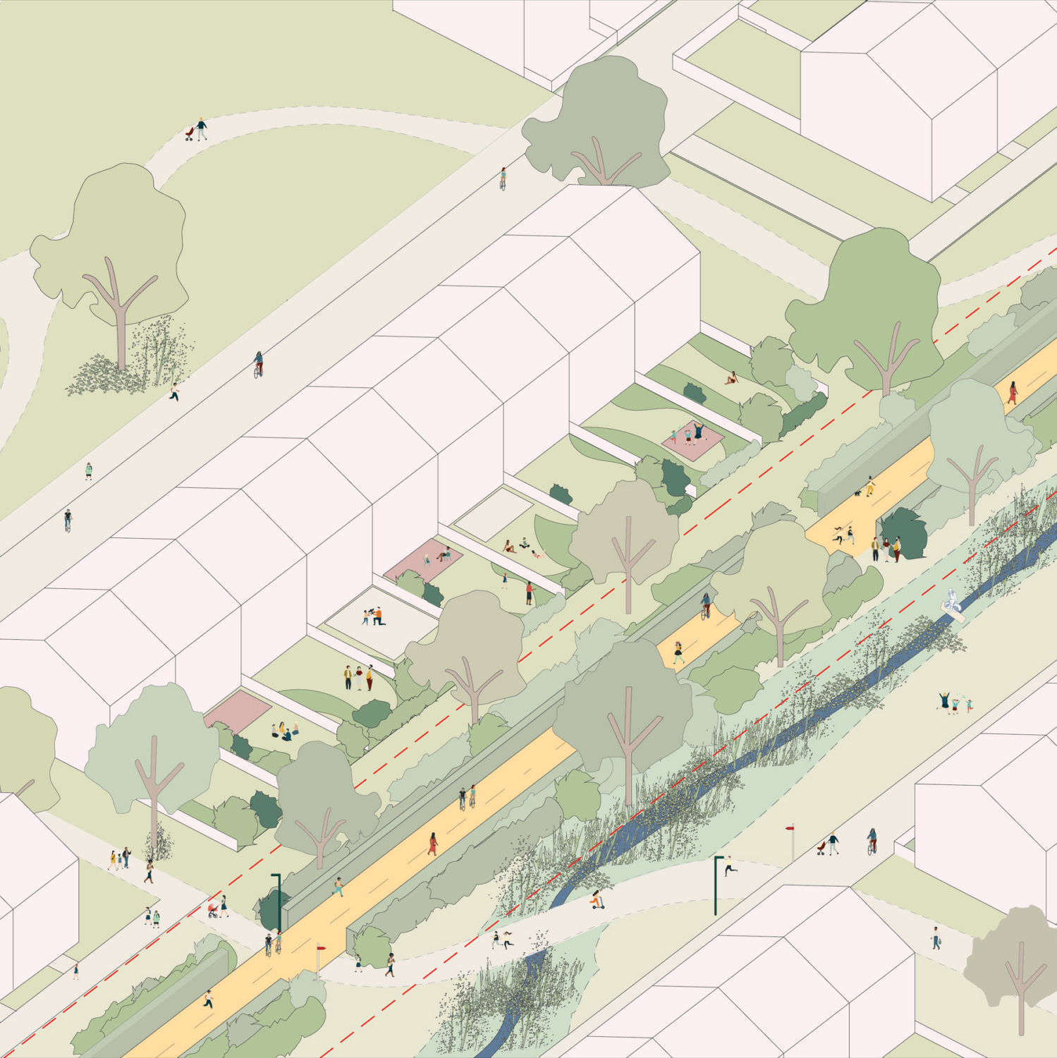 Computer Collage of repurposed green lane as active travel corridor within strategic green infrastructure