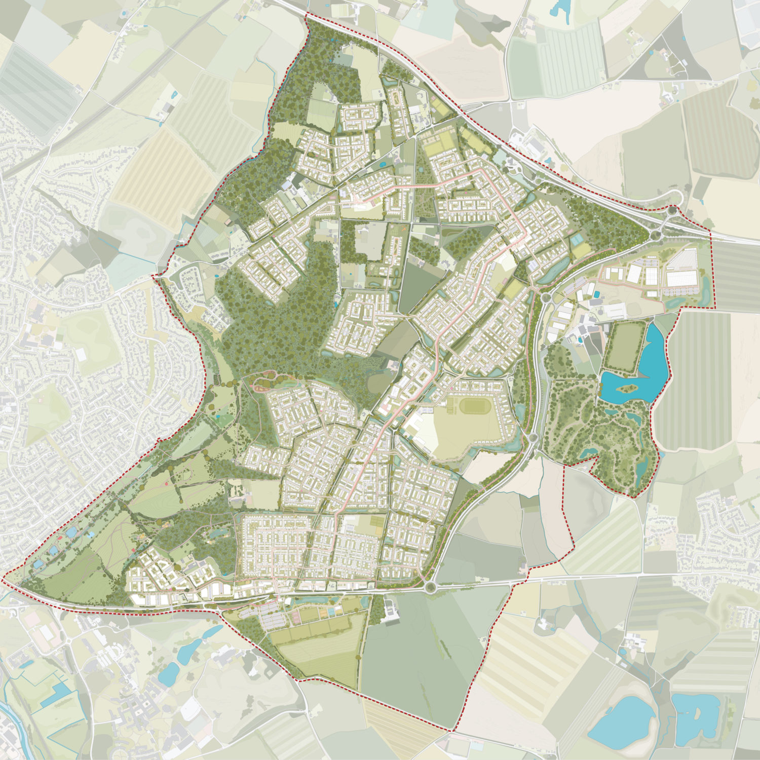 The masterplan is influenced by the ecologically rich rural landscape, which includes arable farmland and ancient woodlands interspersed with hedgerow corridors.