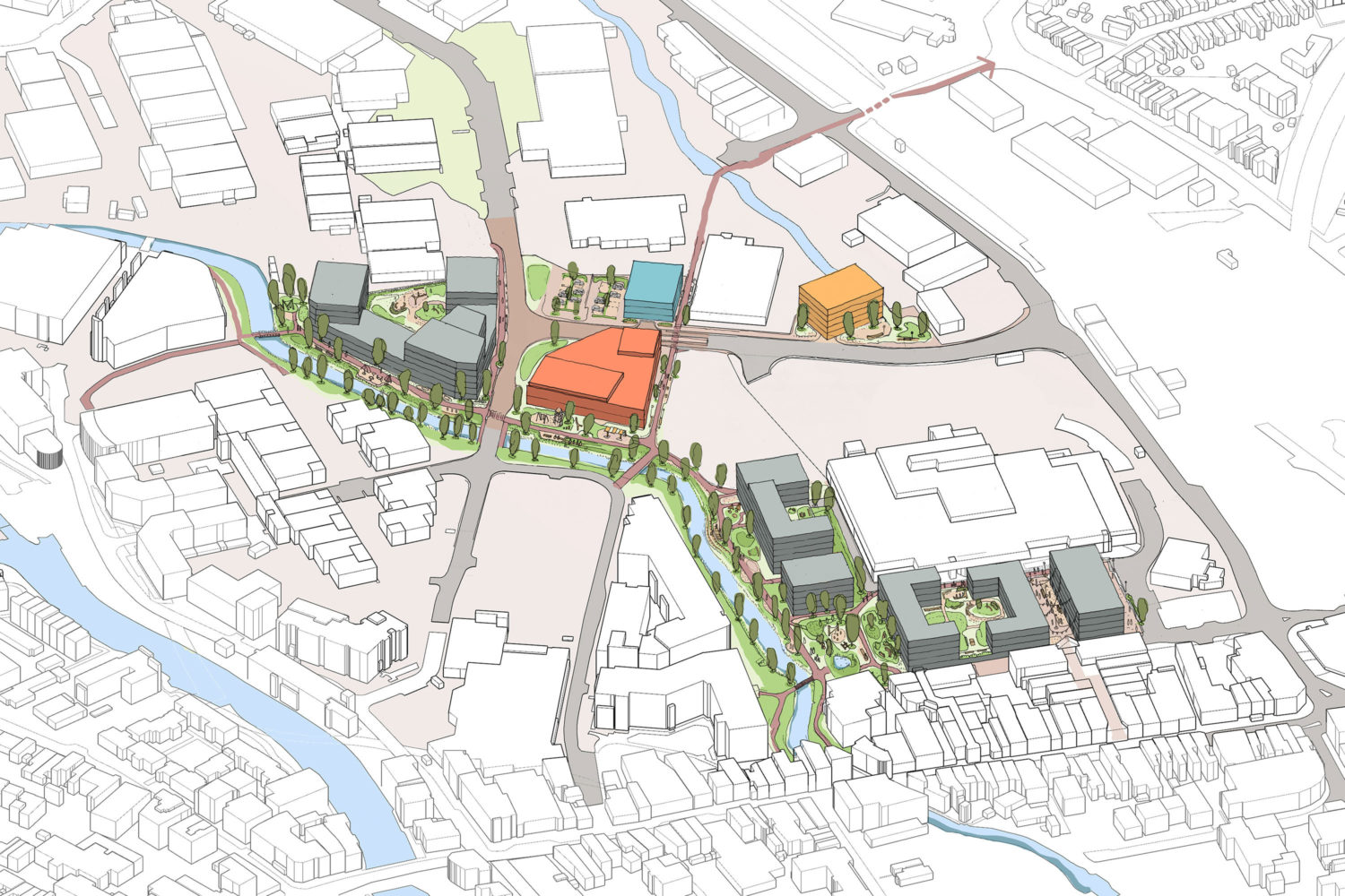Mace and Periscope led the preparation of the masterplan framework and spatial development proposals, supported by viability and delivery advice from Vail Williams to ensure the vision was grounded in deliverability. Periscope tested the capacity for over 120 new homes across a range of typologies and massing options, alongside new social infrastructure including a primary healthcare facility. Periscope also led the public realm strategy, shaping a new linear park along the river and strengthening east–west connections across the town centre.